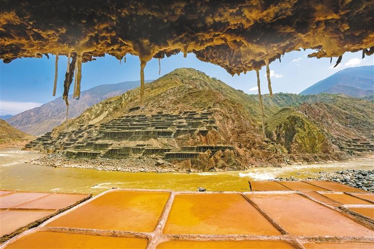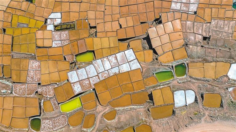 鹽田里,60歲的乃柯正和丈夫一起用木拍夯實鹽田?!艾F(xiàn)在用泵抽水輕松多了,但拍鹽田的手藝不能丟?!崩先说脑捳Z中,既有對科技的接納,也有對傳統(tǒng)的堅守。鹽田下方,鹽晶垂落成簾,在山風拂動下閃爍微光,仿佛在訴說著什么。一塊塊鹽田如同一面面鏡子,既映照出千年文明的厚重,也折射著鄉(xiāng)村振興的希望。當鹽民們輕掃鹽田,他們掃的不僅是晶瑩的鹽,更是一份在傳承與創(chuàng)新中守護的鄉(xiāng)愁。 圖/記者 阿旺尼瑪