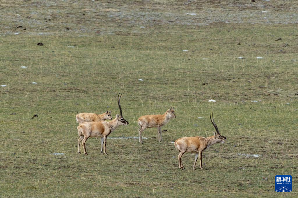 在羌塘國家級自然保護(hù)區(qū)核心區(qū)拍攝到的雄性和亞成體雌性藏羚羊(6月9日攝)。新華社記者 旦增尼瑪曲珠 攝 ??