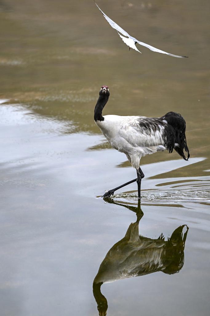 在西藏那曲市申扎縣,一只黑頸鶴試圖驅(qū)趕鳥巢附近活動的漁鷗(2025年6月4日攝)。新華社記者 孫瑞博 攝