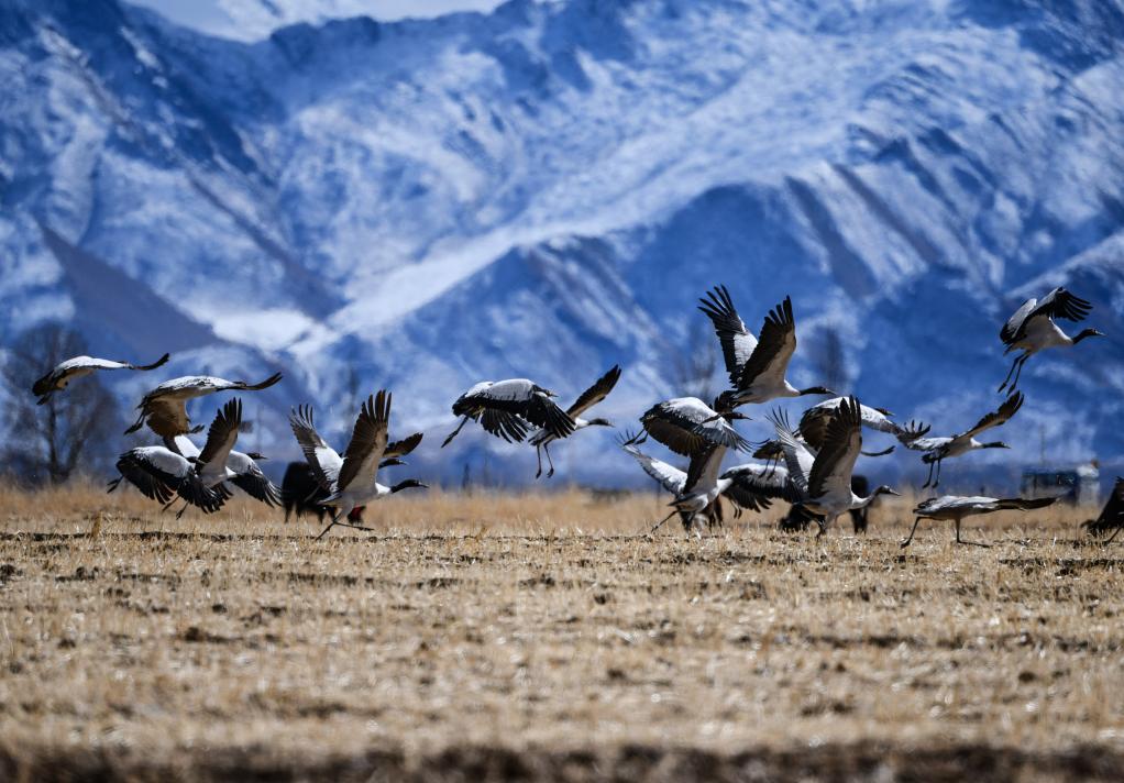 在拉薩市林周縣境內(nèi)拍攝的飛翔于田野上的黑頸鶴(2023年12月8日攝)。新華社記者 晉美多吉 攝
