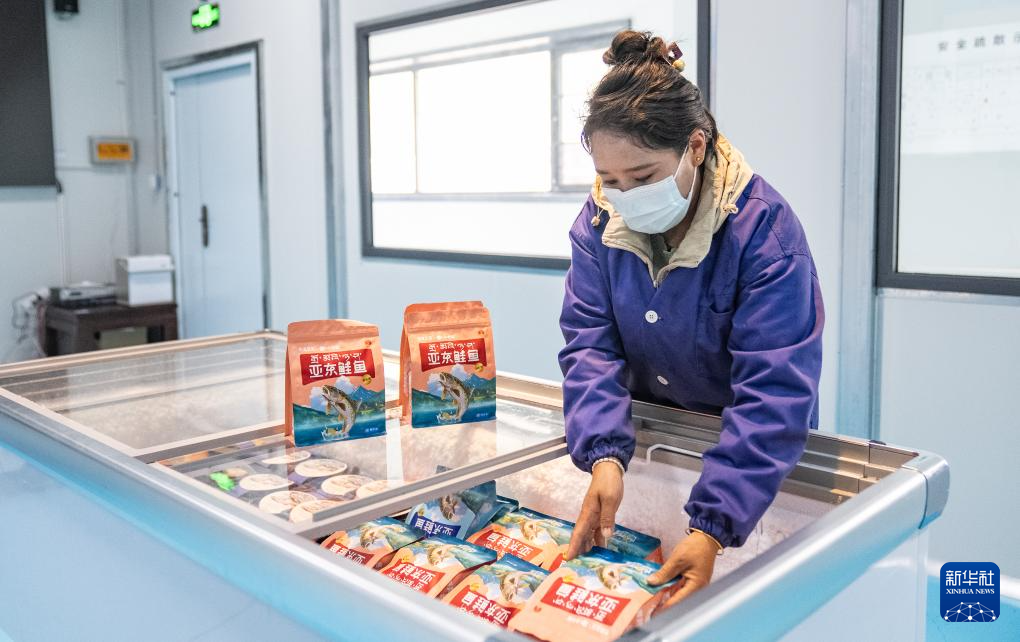 工作人員在車(chē)間內(nèi)將亞?wèn)|鮭魚(yú)的加工產(chǎn)品放入冷藏柜(6月19日攝)。新華社記者 丁增尼達(dá) 攝 ??