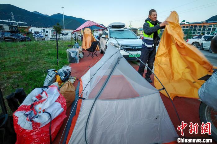 6月26日,摩旅理發(fā)師李秋實(shí)到達(dá)西藏林芝宇拓公園自駕露營地,搭建帳篷準(zhǔn)備過夜。中新社記者 江飛波 攝