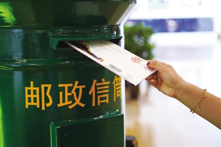 游客正在郵政服務(wù)點(diǎn)選購(gòu)、寄出明信片。