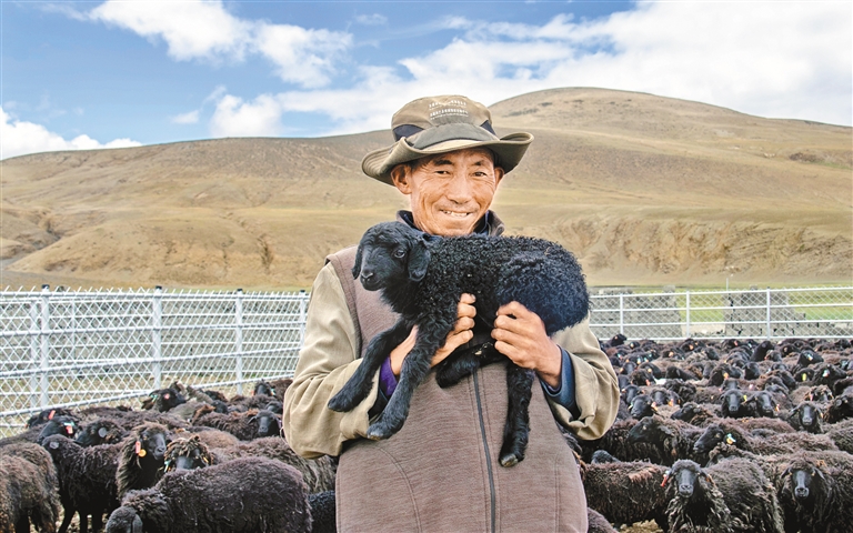 七月,在平均海拔5000多米的日喀則市崗巴縣孔瑪鄉(xiāng),空氣中依然透著絲絲涼意。一聲聲“咩咩”的聲音打破了草原的寧靜。一只剛出生的黑色小羊羔,裹著一層透明的胎衣,烏黑油亮,臥在地上直打顫?!坝质且恢唤】档男⊙颍】磥斫衲杲痈嵊坠ぷ鲿軋A滿。”孔瑪鄉(xiāng)黑綿羊養(yǎng)殖專業(yè)合作社理事長拉貴抱起小羊,臉上洋溢著喜悅。