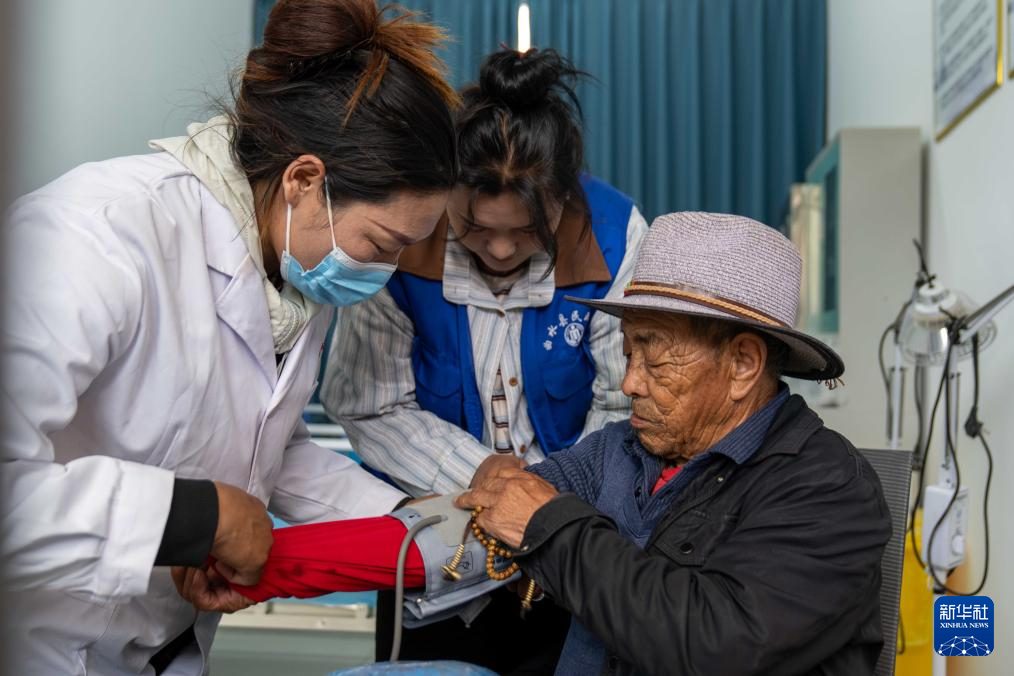 7月17日,村醫(yī)德慶拉姆在三有村幸福驛站日間照料室里為老人測量血壓。新華社記者 旦增尼瑪曲珠 攝 ??