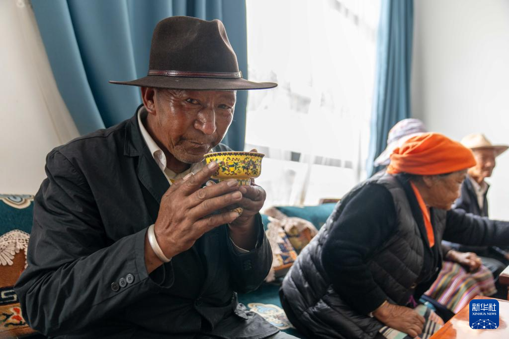 7月17日,洛桑群培老人在三有村幸福驛站日間照料室里喝茶。新華社記者 旦增尼瑪曲珠 攝 ??