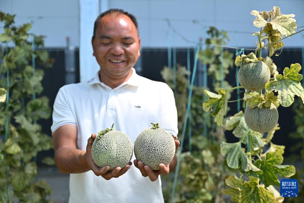 7月19日,西藏扎囊縣綠之源現(xiàn)代農(nóng)業(yè)科技股份有限公司的農(nóng)業(yè)技術人員李紹忠在大棚內展示網(wǎng)紋蜜瓜。新華社記者 李鑫 攝