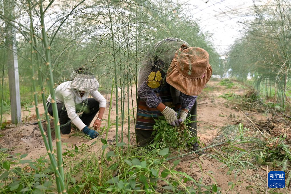 ?7月19日,西藏扎囊縣綠之源現(xiàn)代農(nóng)業(yè)科技股份有限公司的員工在有機蘆筍大棚內手工除草。新華社記者 李鑫 攝 ??