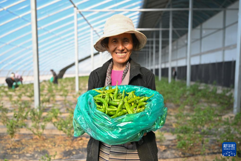 7月19日,西藏扎囊縣綠之源現(xiàn)代農(nóng)業(yè)科技股份有限公司的員工次旺拉吉展示剛采摘下來的有機辣椒。新華社記者 李鑫 攝 ??