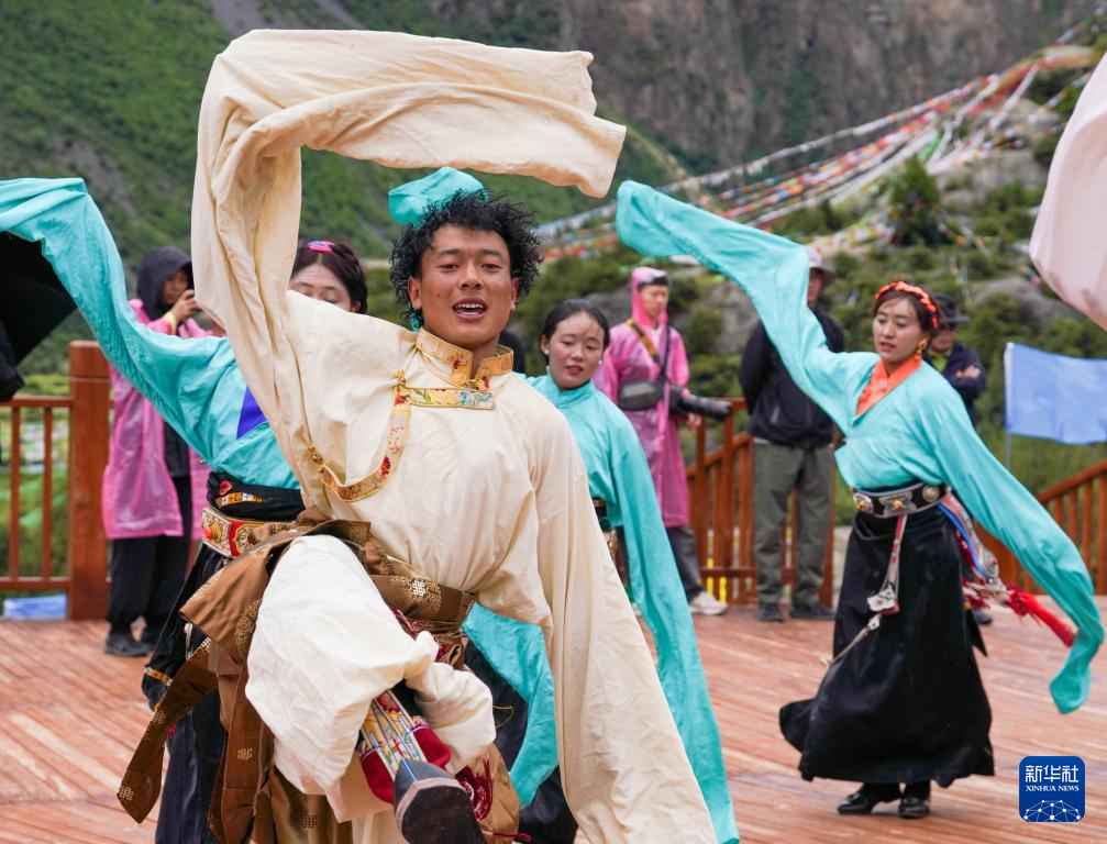 邊壩縣普玉一村的文藝隊演員在“三色湖”觀景臺上為游客表演鍋莊(7月20日攝)。新華社記者 晉美多吉 攝 ??