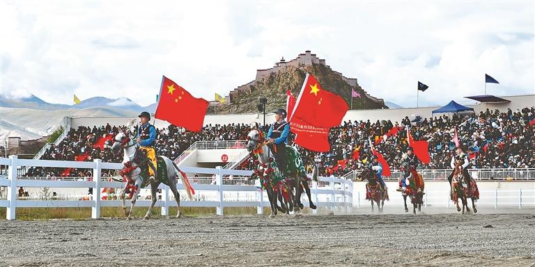 開幕式上,100匹駿馬踏著鼓點(diǎn)奔騰而來。騎手們手持國旗,馬鬃飛揚(yáng),金黃的青稞穗與潔白的哈達(dá)交織成畫。緊隨其后的方隊(duì)演繹著傳統(tǒng)與現(xiàn)代的對(duì)話,深情表達(dá)了江孜人民對(duì)黨的無限感恩、對(duì)祖國的無限熱愛、對(duì)西藏繁榮發(fā)展的美好祝愿。