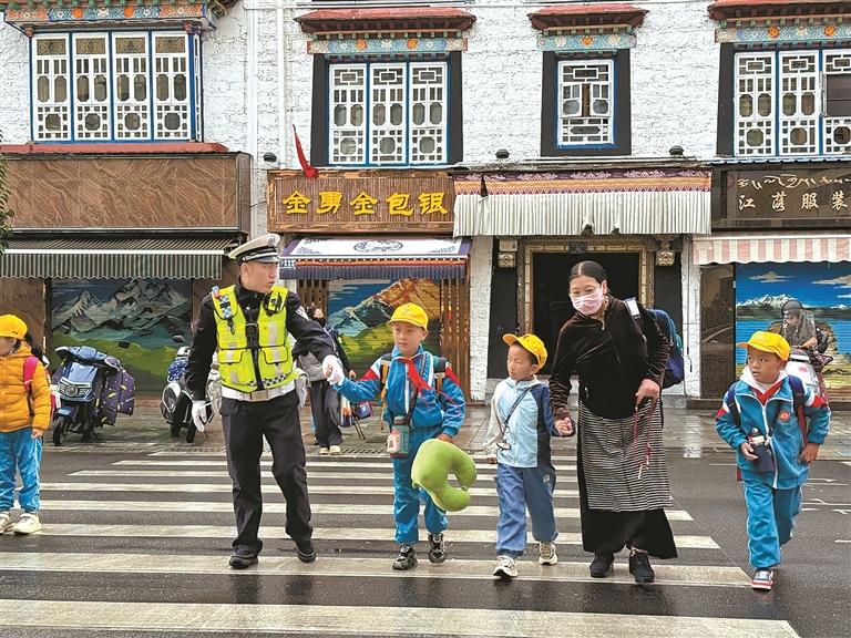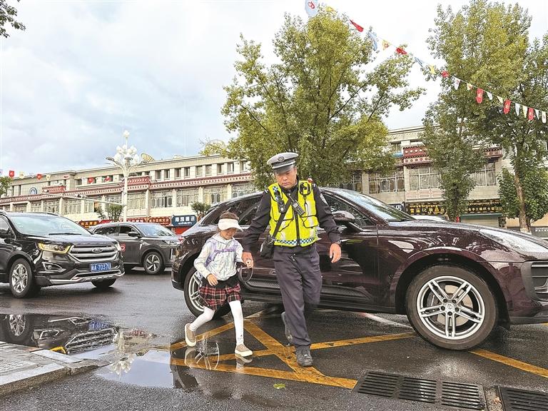 圖為拉薩市公安局交通管理支隊(duì)民警幫助獨(dú)行的學(xué)生穿過車流。記者 鹿麗娟 攝