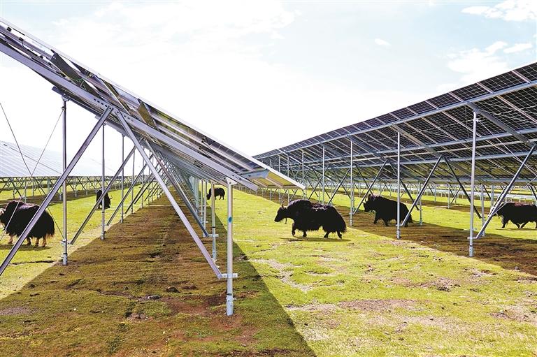 光伏板下悠然吃草的牦牛。記者 袁海霞 攝