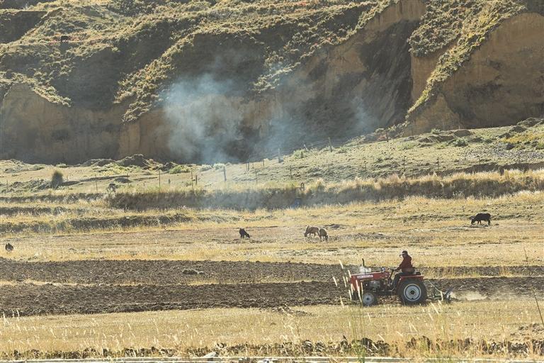 在鄉(xiāng)村農(nóng)田里,轟鳴的拖拉機(jī)穿梭田間,犁鐮將收割后的麥茬深深翻入地下,黝黑的土壤隨之顯露;成群的牦牛也成為田間主角,與村民、機(jī)械協(xié)同作業(yè),確保秋翻工作按時(shí)完成?!扒锓粌H能疏松土壤、改善土壤結(jié)構(gòu),還可將殘留秸稈深埋,有效增加土壤肥力,為來年農(nóng)業(yè)生產(chǎn)打下堅(jiān)實(shí)基礎(chǔ)?!崩_市墨竹工卡縣一村民表示,此次秋翻作業(yè)既保障了前期糧食顆粒歸倉,也為后續(xù)春耕生產(chǎn)做好了充分準(zhǔn)備。