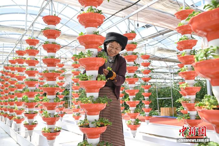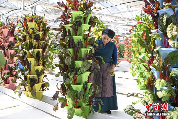 圖為當(dāng)?shù)毓と嗽谀窆たh現(xiàn)代化農(nóng)業(yè)示范園里工作。中新社記者 貢嘎來(lái)松 攝