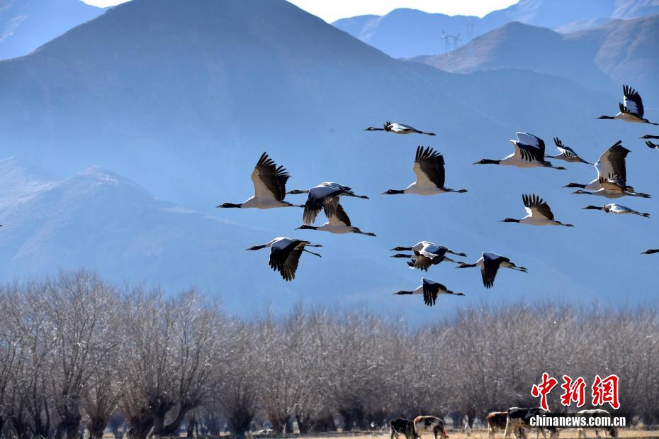 11月14日,西藏日喀則市桑珠孜區(qū)邊雄鄉(xiāng)越冬的黑頸鶴。黑頸鶴是全球十五種鶴類中唯一在高原地區(qū)繁殖和越冬的鶴類,屬中國國家一級保護動物。每年10月中下旬左右,黑頸鶴陸續(xù)飛抵雅魯藏布江中游河谷等地越冬。它們漫步田間地頭、悠閑覓食,為雪域高原的冬日增添了一道靈動的風景線。中新社記者 李林 攝