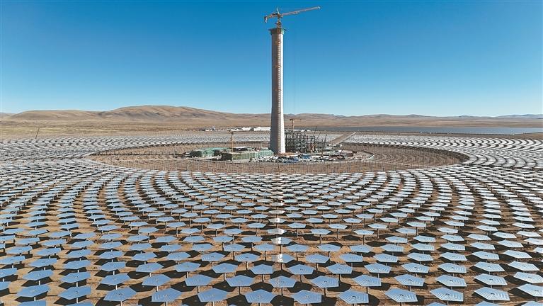 記者在施工現(xiàn)場(chǎng)了解到,該吸熱塔配置近1.6萬(wàn)臺(tái)定日鏡,總采光面積超80萬(wàn)平方米,工人正在緊張有序安裝,計(jì)劃于明年3月搭建完畢,塔頂吸熱器擬于明年4月安裝完成。屆時(shí)一座座五邊形的定日鏡,就像草原上的一朵朵“向日葵”,實(shí)時(shí)追蹤太陽(yáng)位置,將陽(yáng)光反射至中央吸熱塔,呈現(xiàn)“萬(wàn)鏡朝陽(yáng)、塔耀雪山”的壯麗景象,如同科幻電影里的場(chǎng)景,成為藏北高原上一座“亮眼”的綠色能源地標(biāo)。