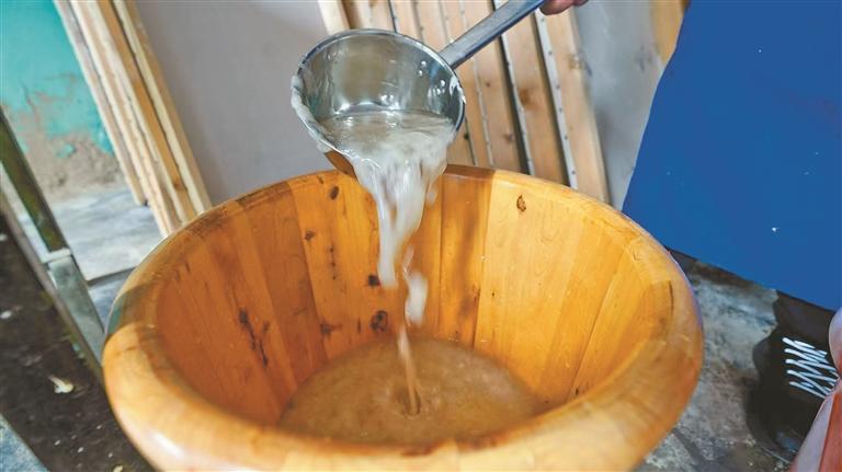 圖為阿旺曲央反復(fù)攪拌紙漿,持續(xù)調(diào)和使其更緊密均勻。