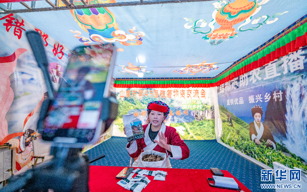 12月1日,一位電商主播在西藏自治區(qū)山南市第45屆雅礱物資交流會現(xiàn)場介紹產(chǎn)品。新華網(wǎng) 旦增努布 攝