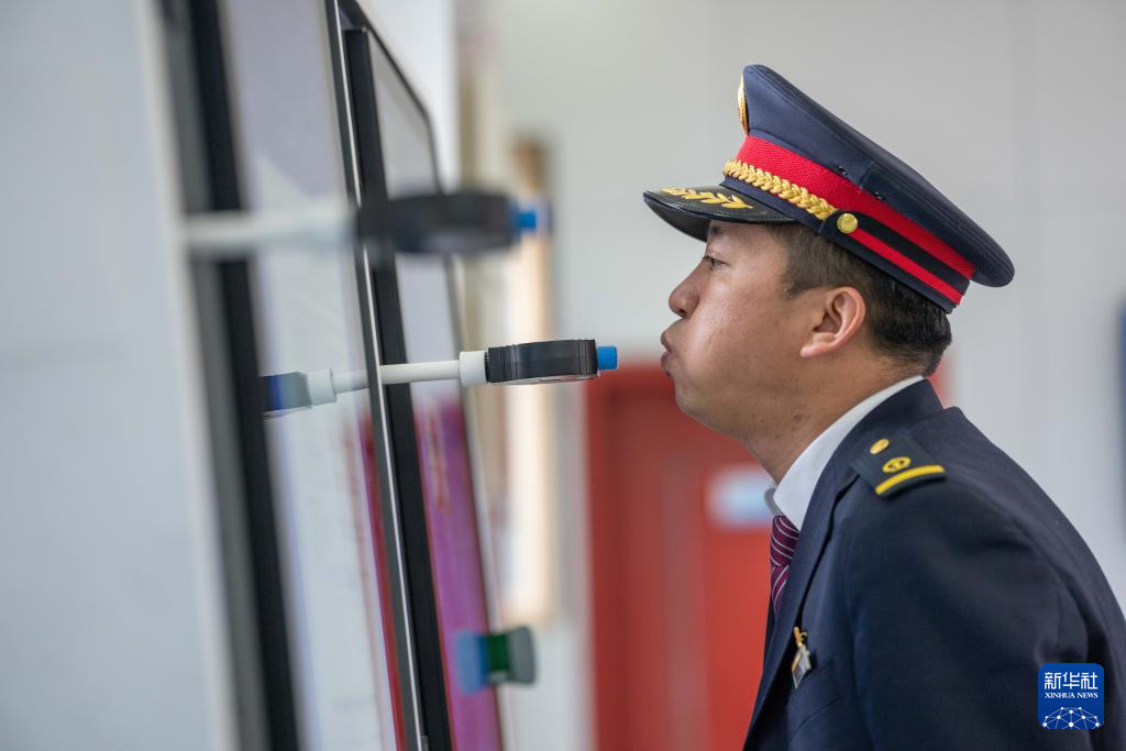 2月14日,斯朗旺扎出勤前進(jìn)行酒精測試。新華社記者 旦增尼瑪曲珠 攝?