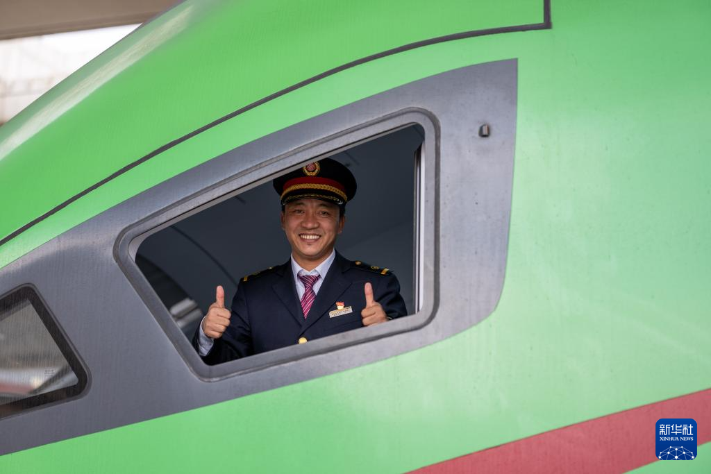 2月14日,斯朗旺扎和他駕駛的“復(fù)興號”動車組留影。新華社記者 旦增尼瑪曲珠 攝