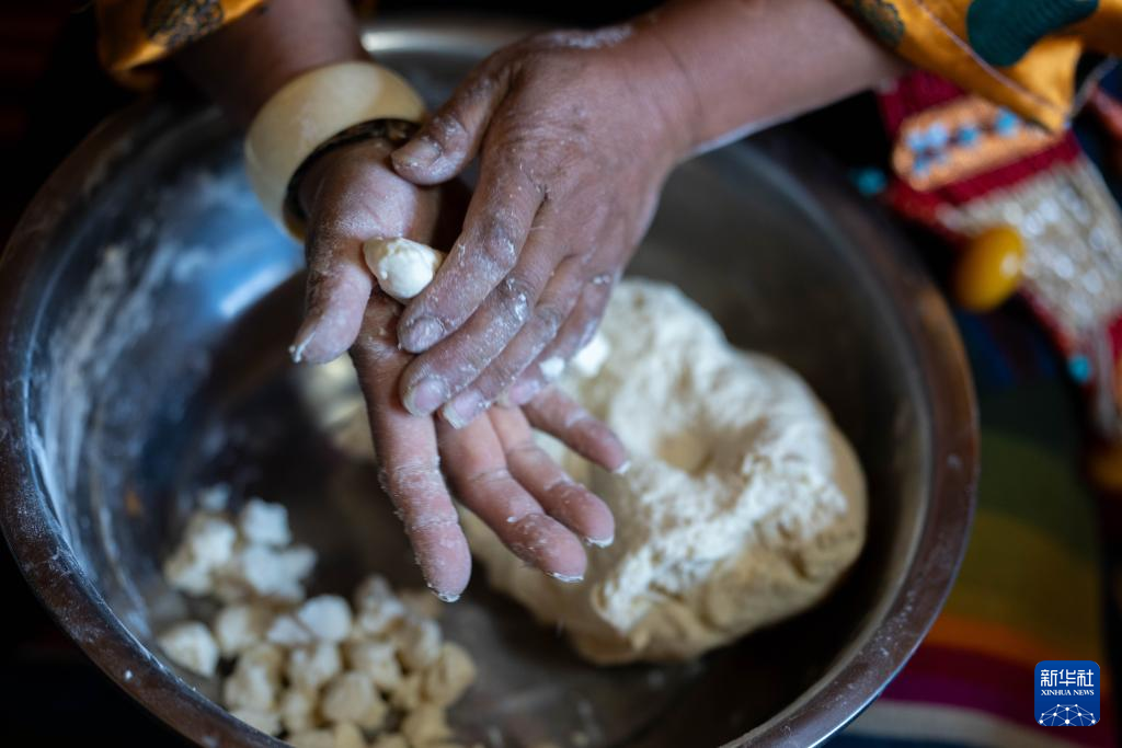 2月16日,長所鄉(xiāng)古榮村村民卓瑪次仁在制作年節(jié)食品“古突”。在藏語中,“古”意為“九”,“突”意為“面”,“古突”是一種用牦牛肉湯加入牛肉、蘿卜、奶渣等食材熬煮的面食。按西藏傳統(tǒng)習(xí)俗,“古突”夜,家家戶戶迎來團(tuán)聚,一起享用“古突”。新華社記者 旦增尼瑪曲珠 攝