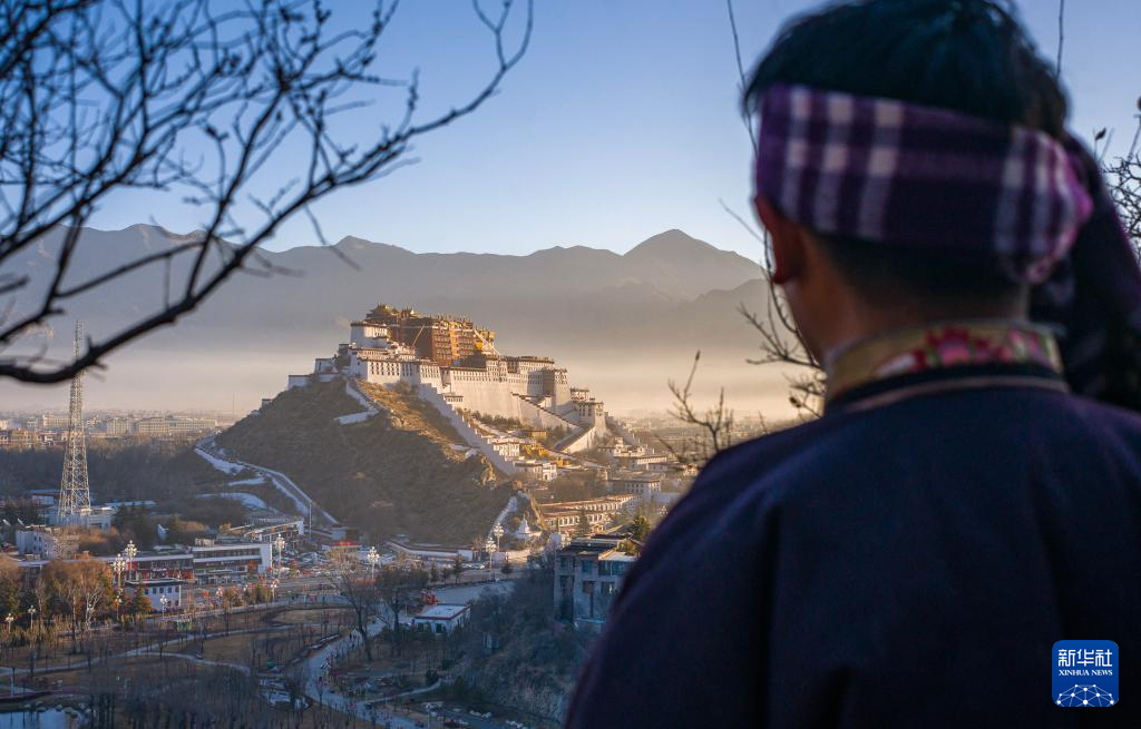 2月18日,拉薩市民在眺望晨光照耀下的布達拉宮。新華社記者 丁增尼達 攝