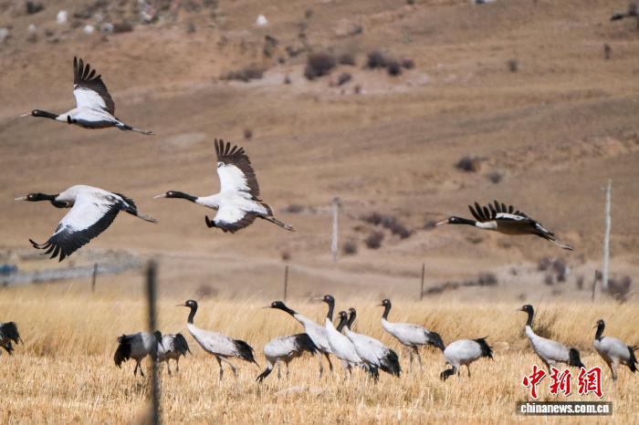 黑頸鶴是中國(guó)國(guó)家一級(jí)保護(hù)動(dòng)物,是唯一生活、繁殖在高原的鶴類,被藏族民眾譽(yù)為“吉祥鳥(niǎo)”。近日,西藏自治區(qū)拉薩市林周縣林業(yè)和草原局介紹,作為黑頸鶴重要的越冬棲息地,今年該縣境內(nèi)黑頸鶴數(shù)量在1800只至2300只之間,其中虎頭山水庫(kù)卡東村一帶占比約一半。中新網(wǎng)記者在周邊看到,不少黑頸鶴在田間覓食,不時(shí)飛翔于高原農(nóng)田、村落上空,舞動(dòng)的鶴影和聲聲鶴鳴為冬春時(shí)節(jié)的高原增添了幾分靈動(dòng)。圖為2月8日,黑頸鶴群在悠閑覓食。江飛波 攝