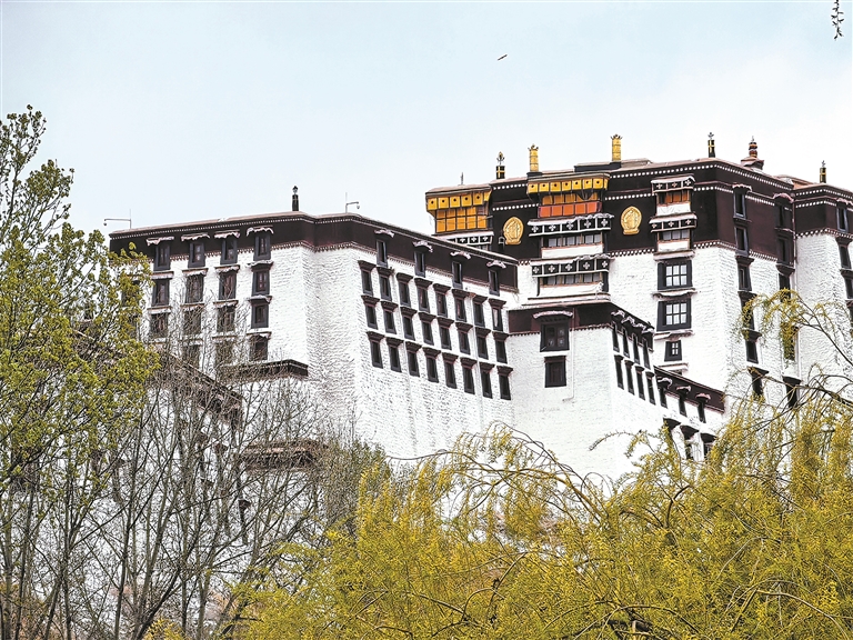 圖為春芽掩映下的布達拉宮紅白宮墻。
