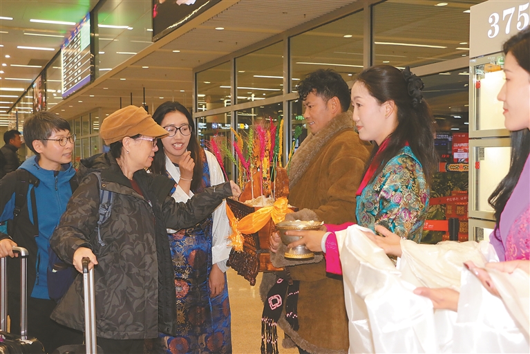當首批香港游客走出機場時,悠揚的歌聲響起,藝術(shù)團成員迎上前,向每一位遠道而來的客人敬獻哈達。