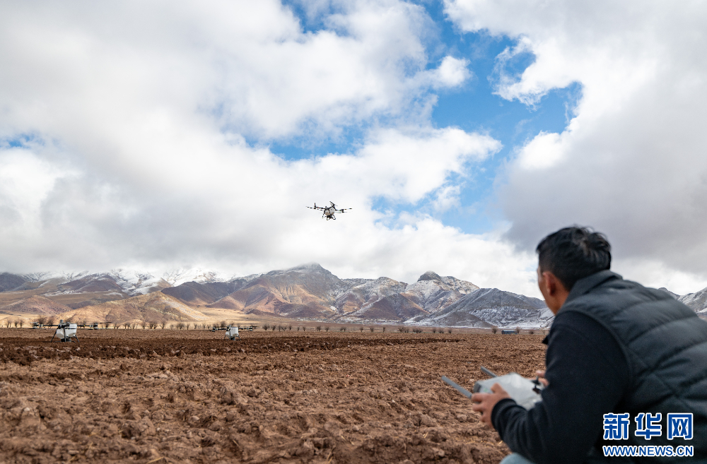 3月16日,西藏拉薩市林周縣春堆鄉(xiāng)春堆村群眾在春耕儀式上操作無(wú)人機(jī)。新華網(wǎng) 旦增努布 攝