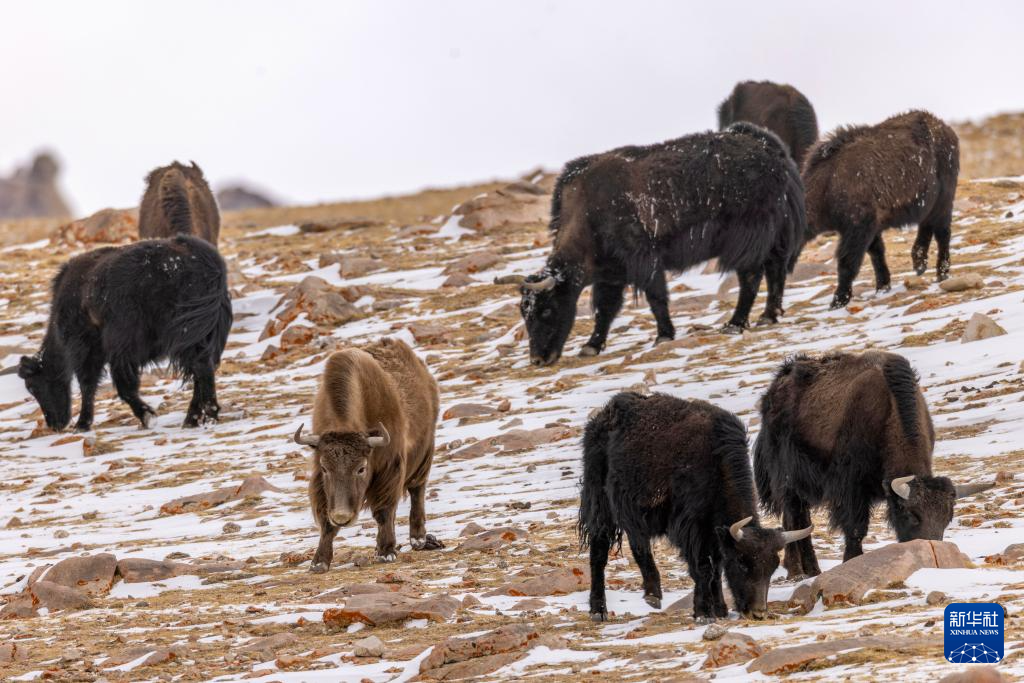這是在藏色崗日冰川附近拍攝的野牦牛群(3月16日攝)。新華社發(fā)(四郎江村攝)