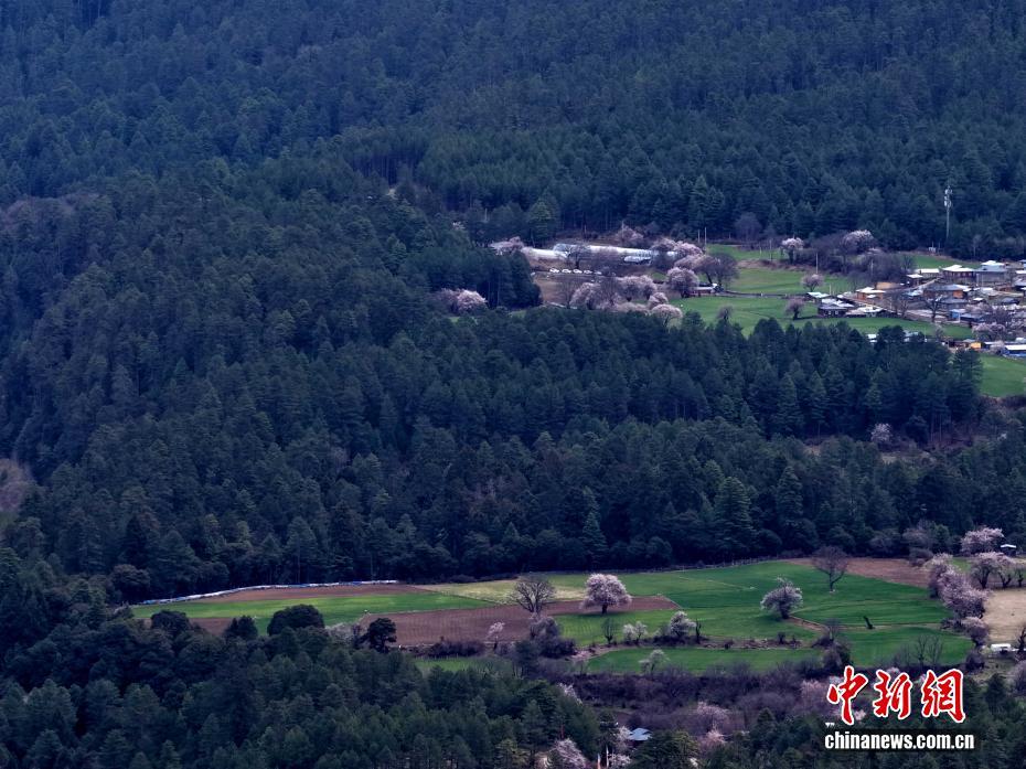 3月26日,西藏波密桃花林海相映成趣。崗云杉林位于西藏林芝市波密縣,森林覆蓋率達(dá)61%以上,海拔2700米左右。俯瞰崗云杉林,周邊桃花綻放,與密林、農(nóng)田構(gòu)成美麗自然畫卷。(無人機(jī)照片)中新社記者 李林 攝