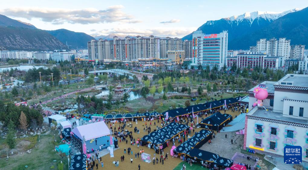 這是4月3日拍攝的林芝第二十三屆桃花旅游文化節(jié)“堆春行動(dòng)”集市現(xiàn)場(無人機(jī)照片)。新華社記者 丁增尼達(dá) 攝
