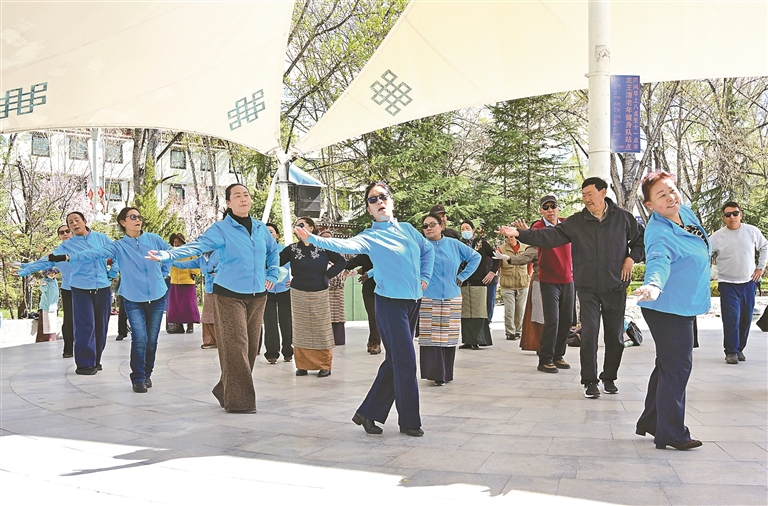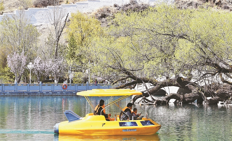 宗角祿康公園內(nèi),春日風(fēng)光靈動又愜意。湖面碧波蕩漾,嫩綠垂柳輕拂水面,一艘艘游船悠然穿行于碧波之上,船上游客歡聲笑語不斷。岸邊廣場上,歡快的音樂此起彼伏,不少市民伴著節(jié)拍跳起健身操,舞步輕盈、神采飛揚(yáng),悠然閑適的靜態(tài)美景與熱情洋溢的動態(tài)活力相互交融,盡顯高原春日別樣風(fēng)情。