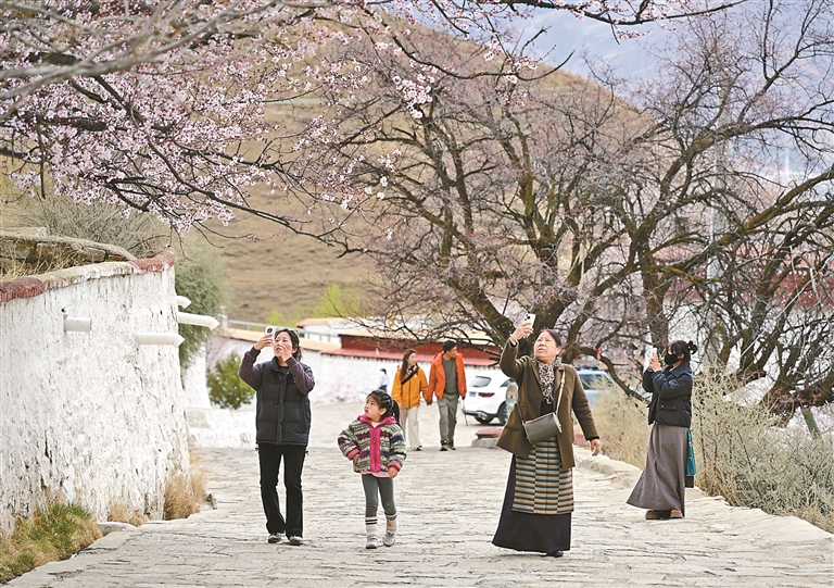 春日的帕邦喀,桃花競相綻放,灼灼芳華鋪滿山間。粉白相間的花海層層疊疊,將古樸建筑掩映其中,勾勒出別樣的詩意畫面。游人漫步花海小徑,或駐足賞花,或拿起相機(jī)定格美景,歡快的笑聲與清幽的花香相互交織,奏響了高原春日里的動人樂章。