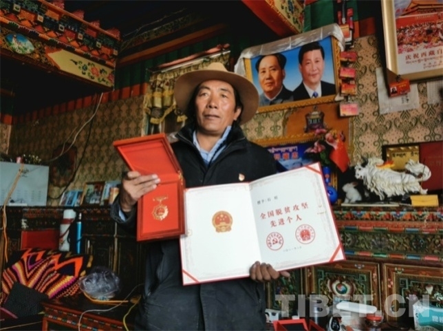 石旺展示全國(guó)脫貧攻堅(jiān)先進(jìn)個(gè)人榮譽(yù)證書。 德吉卓瑪 攝