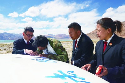 在阿里地區(qū)班公湖旁,常年驅(qū)車穿行于高山荒漠辦案的基層法官們?yōu)橛龅诫y題的牧民布曲真送來了調(diào)解書。布曲真與工程公司有勞務(wù)糾紛,經(jīng)法院訴前調(diào)解終于達成協(xié)議。事情解決了,法官們也開心地笑了。光明日報記者 劉宇航攝