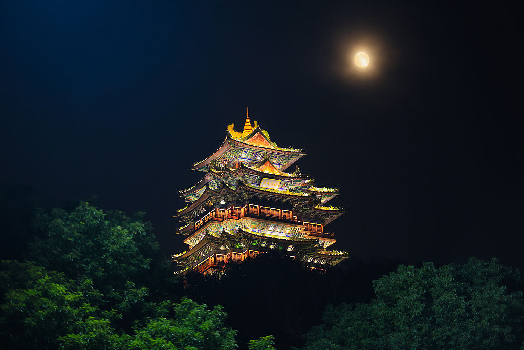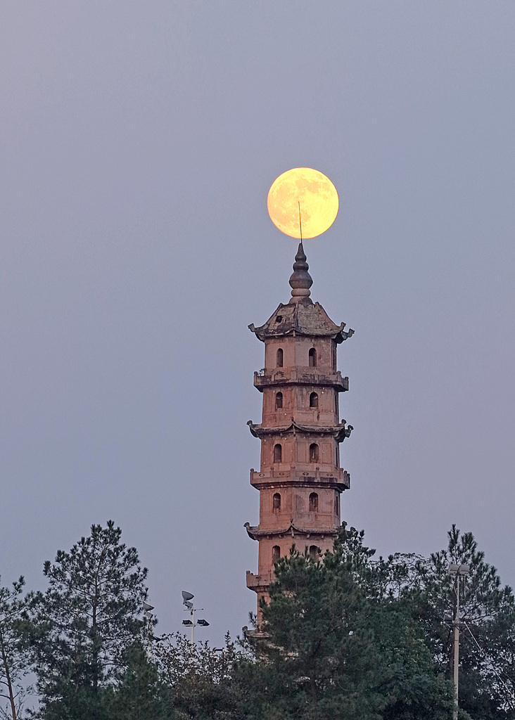 一輪圓月從浙江省臺(tái)州市仙居縣安洲塔上空升起。