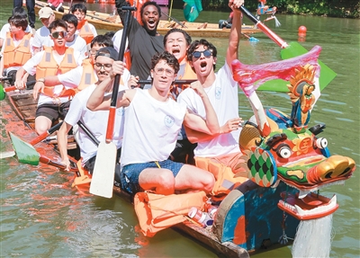 去年,我參加了由杭州余杭區(qū)五常街道組織的龍舟體驗營,親身感受競渡帶來的“速度與激情”。我和同校好友組成隊伍,伴著耳邊觀眾的熱情歡呼揮槳出發(fā),濺起的水花在河道綻放。握槳、入水、拉水、出水、回槳……隨著龍舟劃至終點,我們揮舞校旗、舉槳歡呼。在龍舟運動中,我感受到了奮斗和團(tuán)結(jié)的力量——不同膚色的人們在同一條水道上并肩奮進(jìn),這不正是“同舟共濟”的東方智慧嗎!