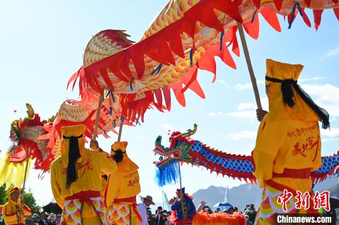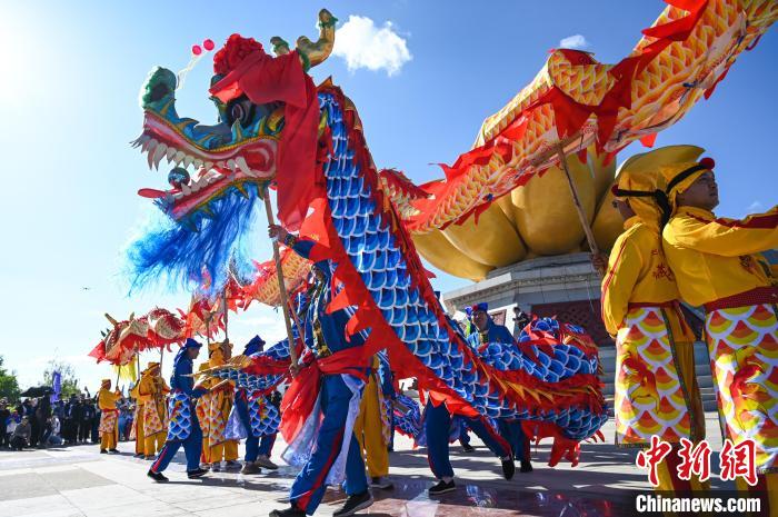 6月9日,2024年西藏自治區(qū)端午節(jié)牛皮船(龍舟)賽在拉薩市濱河公園水域舉辦。據(jù)悉,本次賽事系西藏首次舉辦、也是中國國內(nèi)海拔最高的牛皮船(龍舟)賽 。比賽邀請了來自遼寧、湖北、湖南、四川、云南、貴州和廣西壯族自治區(qū)的30名龍舟運動員,與西藏區(qū)內(nèi)的30名龍舟運動員以及40名牛皮船運動員進(jìn)行同場競技。圖為“舞龍表演”現(xiàn)場。貢嘎來松 攝