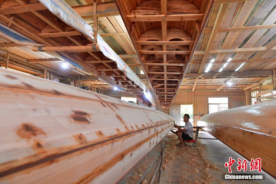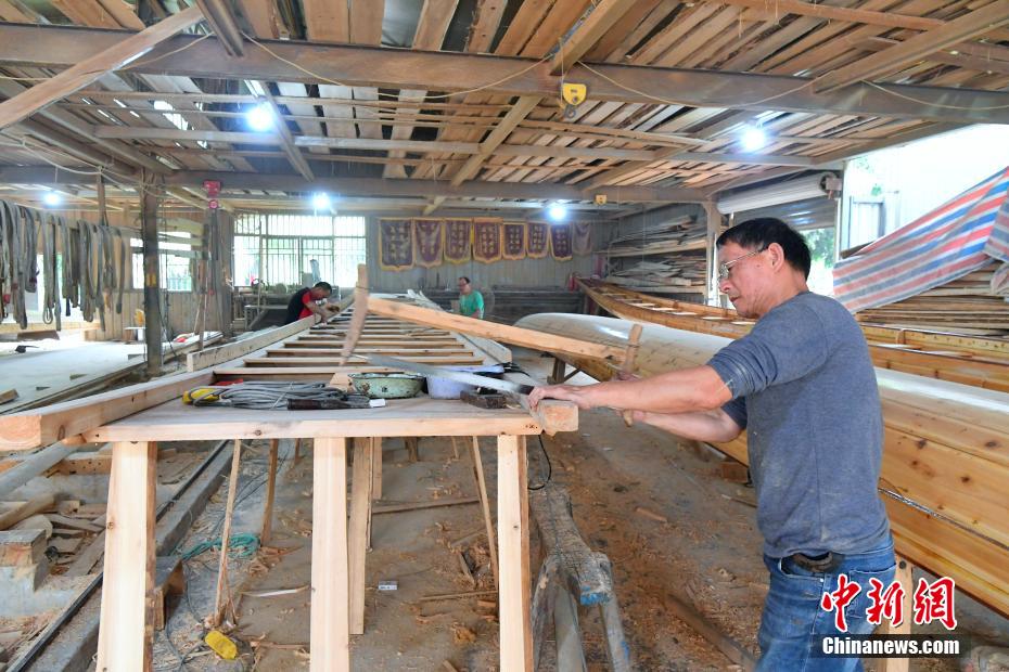 “世界龍舟看中國,中國龍舟看福州,福州龍舟看方莊?!蔽挥诟=ㄊ「V菔虚}侯縣的方莊村,是中國最大的龍舟制造村,有著七百多年制作龍舟的歷史。隨著端午節(jié)臨近,方莊村內(nèi)的龍舟制造廠里,工匠們正加班加點(diǎn)趕制端午節(jié)的龍舟訂單。據(jù)統(tǒng)計(jì),目前該村每年能接到超過200艘龍舟的訂單,總產(chǎn)值約600萬元人民幣。圖為5月25日,在方莊村的“龍舟世家”方忠雄龍舟廠里,師傅在趕制端午節(jié)的龍舟訂單。中新社記者 張斌 攝