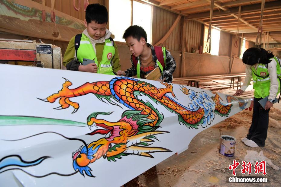 “世界龍舟看中國,中國龍舟看福州,福州龍舟看方莊?!蔽挥诟=ㄊ「V菔虚}侯縣的方莊村,是中國最大的龍舟制造村,有著七百多年制作龍舟的歷史。隨著端午節(jié)臨近,方莊村內(nèi)的龍舟制造廠里,工匠們正加班加點(diǎn)趕制端午節(jié)的龍舟訂單。據(jù)統(tǒng)計(jì),目前該村每年能接到超過200艘龍舟的訂單,總產(chǎn)值約600萬元人民幣。圖為5月25日,在方莊村的“龍舟世家”方忠雄龍舟廠里,前來參觀的小學(xué)生在體驗(yàn)傳統(tǒng)龍舟的制作工藝。中新社記者 張斌 攝