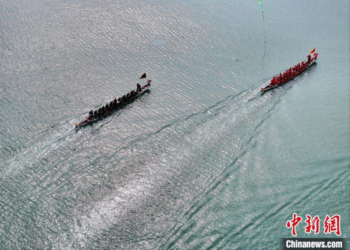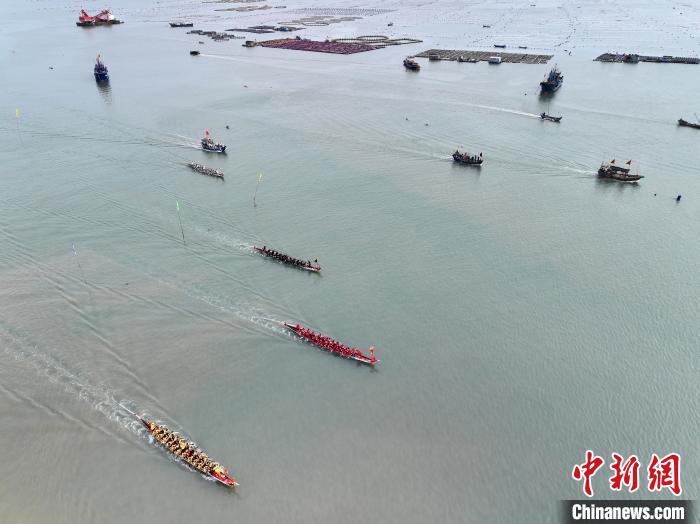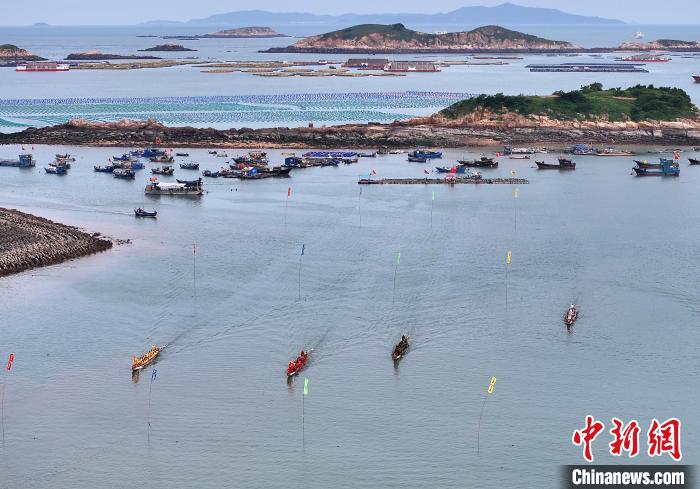 5月27日,福建省連江縣定海村舉行海上龍舟賽活動(dòng),迎接即將到來(lái)的端午節(jié)。(無(wú)人機(jī)照片)中新社記者 張斌 攝