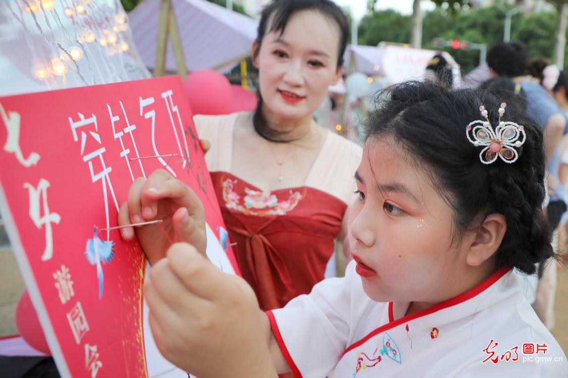 2025年8月20日傍晚,在安徽省六安市金安區(qū)東市街道開(kāi)展的“七夕”游園會(huì)上,志愿者在帶領(lǐng)市民和小朋友手工制作香囊。當(dāng)日,六安市金安區(qū)東市街道在轄區(qū)金水灣體育公園開(kāi)展“睦鄰東市·‘河’你共此夕”主題七夕游園會(huì)活動(dòng)。通過(guò)漆扇繪制、香囊制作、穿針乞巧等民俗體驗(yàn),吸引市民參與傳統(tǒng)文化互動(dòng),既傳承節(jié)日文化內(nèi)涵,又以文化活動(dòng)為紐帶促進(jìn)鄰里交流,營(yíng)造文明和諧社區(qū)氛圍,提升群眾獲得感和幸福感。(田凱平攝/光明圖片)