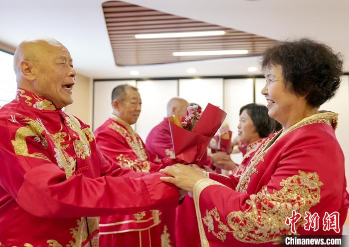 七夕將至,河北省邯鄲市老人走進(jìn)叢臺(tái)區(qū)光明橋街道天璽苑社區(qū),參加“七夕迎金婚 共創(chuàng)好家風(fēng)”慶典,回憶半個(gè)世紀(jì)的愛情。金婚慶典儀式經(jīng)過牽手入場(chǎng)、夫妻對(duì)拜、執(zhí)子之手、回憶往昔等環(huán)節(jié),見證了金婚夫妻們相濡以沫、互敬互愛的美滿婚姻。金婚老人結(jié)合親身經(jīng)歷,分享家風(fēng)家訓(xùn)及愛情故事,講述家庭幸福的秘訣,“曬”出婚姻保鮮的秘籍,分享婚姻的經(jīng)營智慧。圖為8月6日,丈夫?yàn)槔习閮韩I(xiàn)鮮花。王倩倩 攝