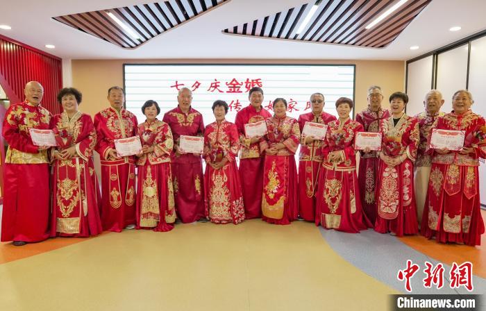 七夕將至,河北省邯鄲市老人走進(jìn)叢臺(tái)區(qū)光明橋街道天璽苑社區(qū),參加“七夕迎金婚 共創(chuàng)好家風(fēng)”慶典,回憶半個(gè)世紀(jì)的愛情。金婚慶典儀式經(jīng)過牽手入場(chǎng)、夫妻對(duì)拜、執(zhí)子之手、回憶往昔等環(huán)節(jié),見證了金婚夫妻們相濡以沫、互敬互愛的美滿婚姻。金婚老人結(jié)合親身經(jīng)歷,分享家風(fēng)家訓(xùn)及愛情故事,講述家庭幸福的秘訣,“曬”出婚姻保鮮的秘籍,分享婚姻的經(jīng)營智慧。圖為8月6日,金婚夫妻合影留念。王倩倩 攝