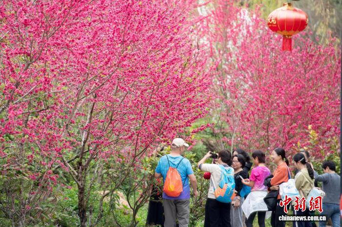 “福建最美鄉(xiāng)村”永春縣北溪村桃花迎春綻放。圖為2月27日,游客在永春縣北溪文苑游玩賞花。康慶平 攝