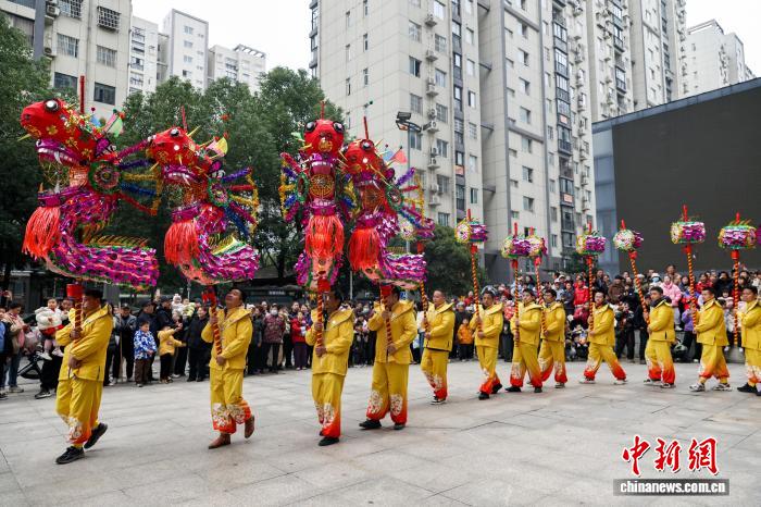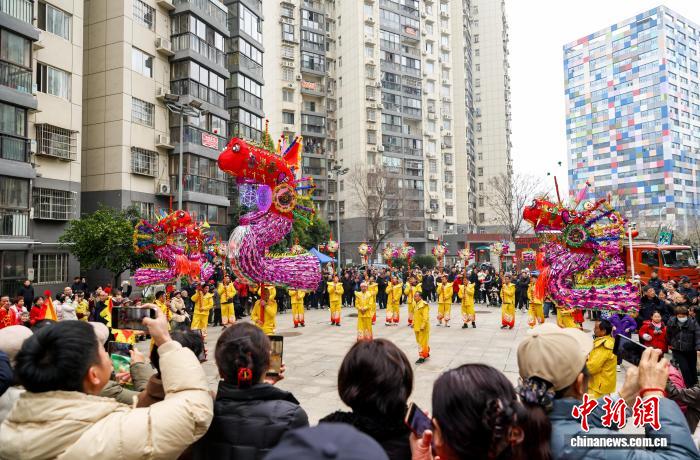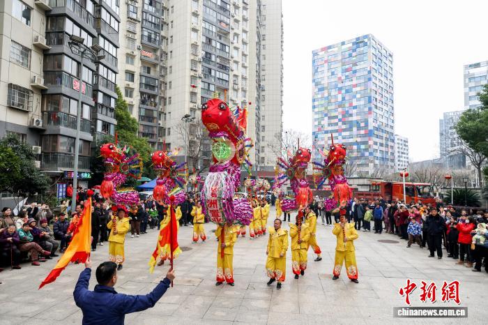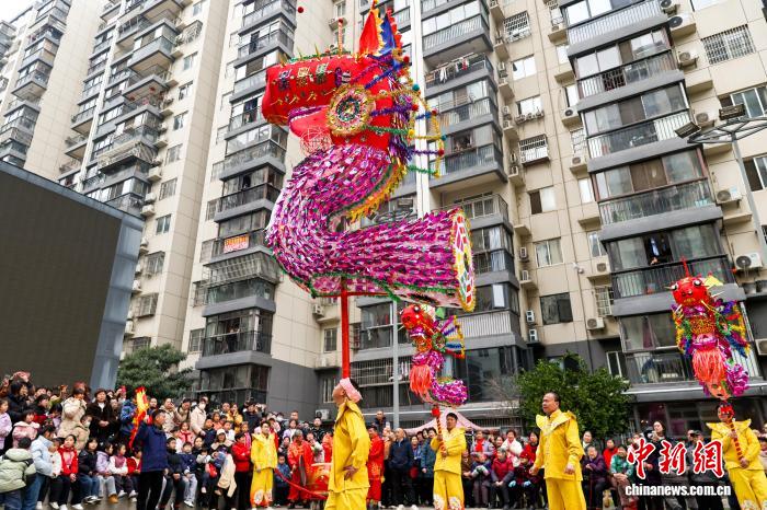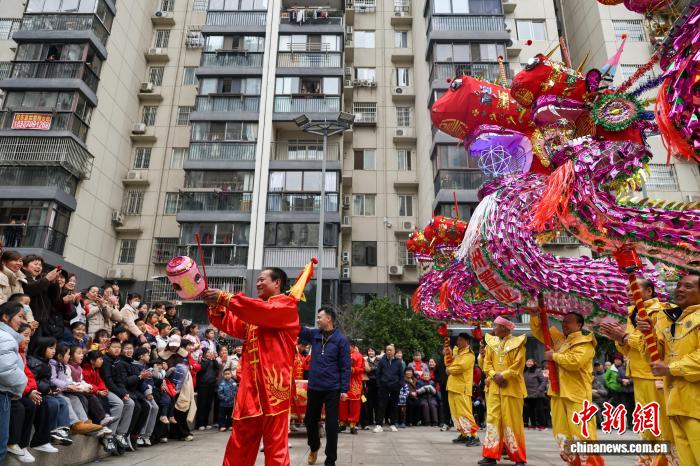 2月27日,湖北武漢,國家級非遺漢陽高龍走進(jìn)社區(qū)進(jìn)行表演,以傳統(tǒng)民俗為居民送上馬年元宵祝福。圖為高龍表演吸引民眾觀看。中新社記者 張暢 攝