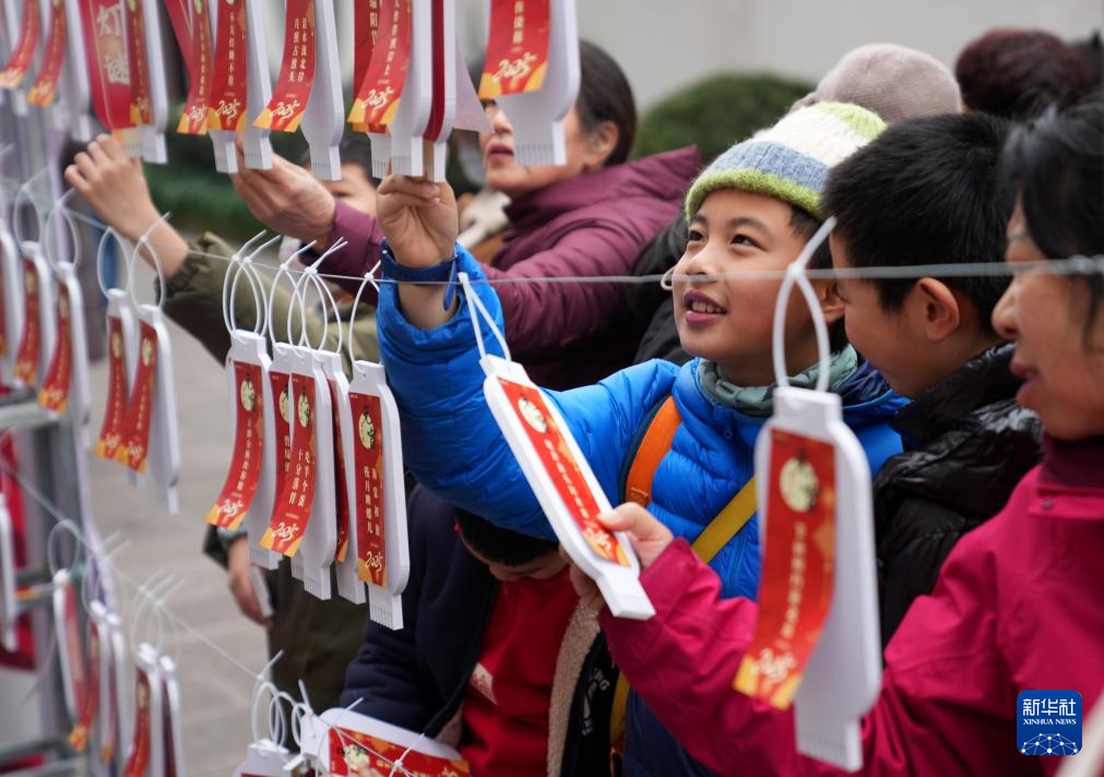 2月11日,在浙江杭州市西湖區(qū)北山街道元宵文化廟會(huì)活動(dòng)中,社區(qū)居民在猜燈謎。